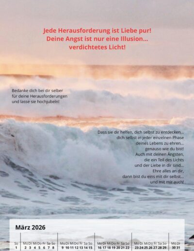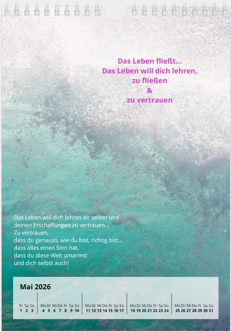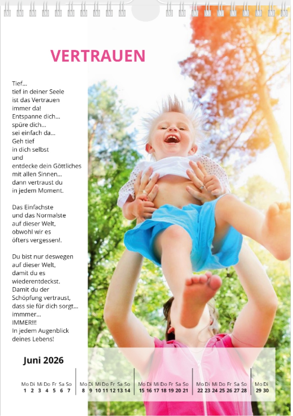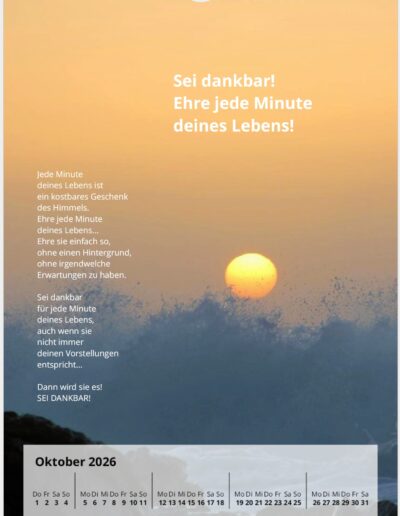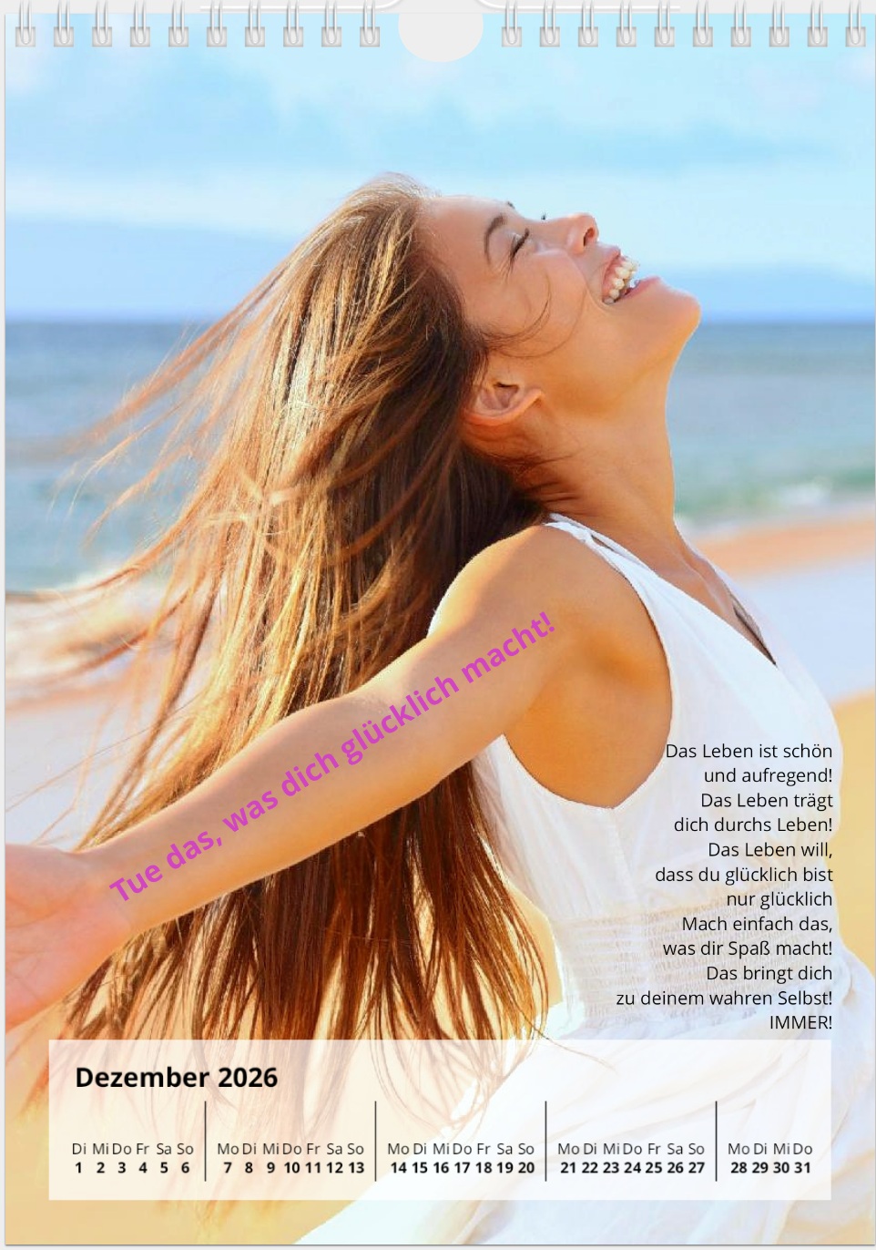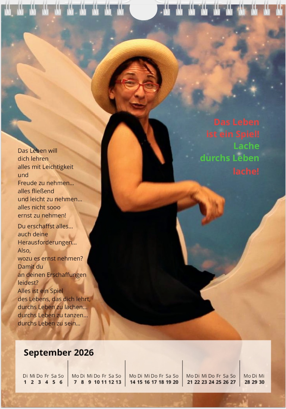 Freude, Dankbarkeit, Vertauen, Hingabe, Liebe, Lachen… Das Leben als Spiel sehen… lauter Qualitäten der Seele, die das Leben schöner machen… durchfluten diesen Kalender!