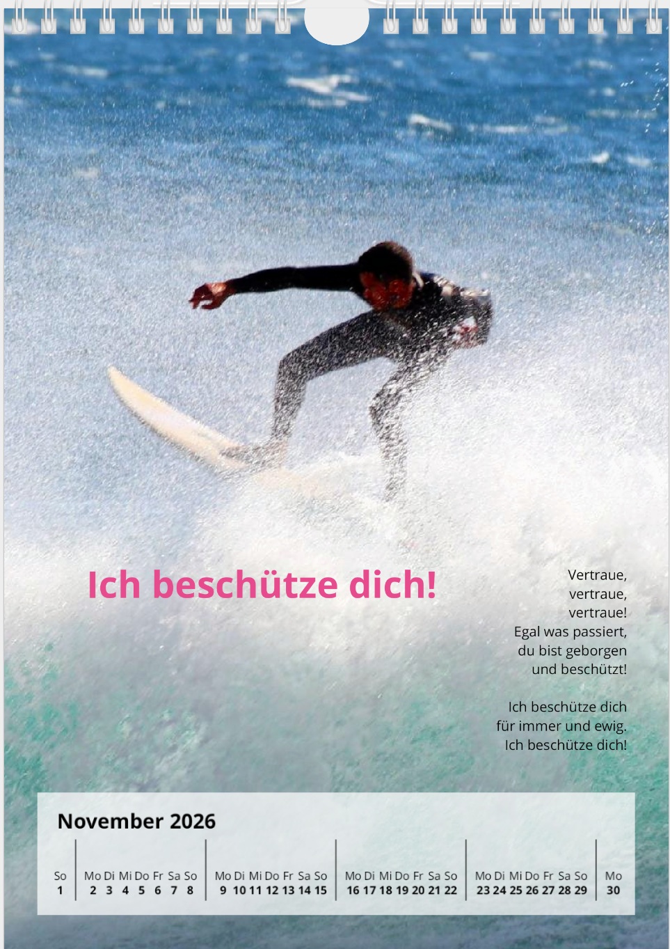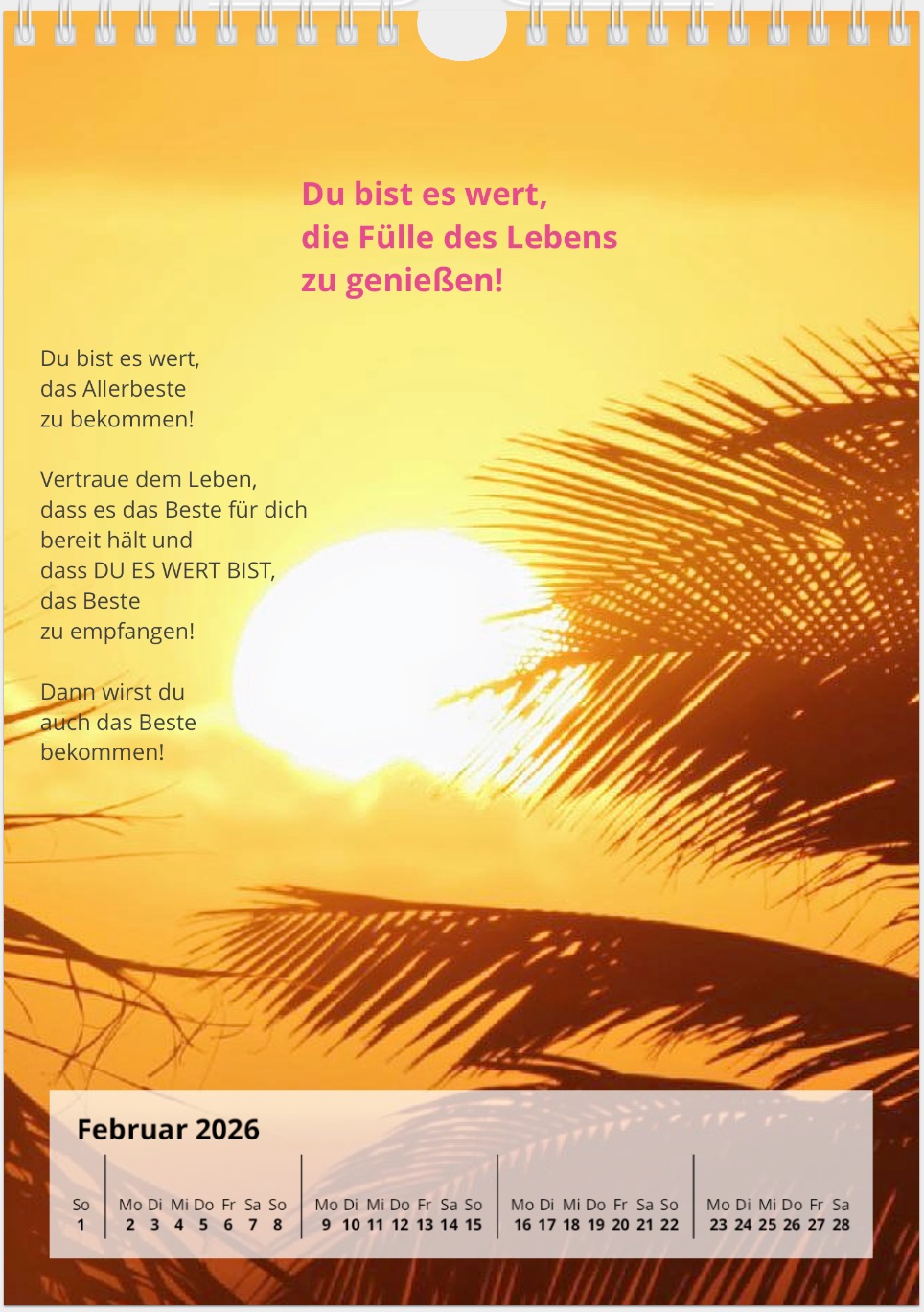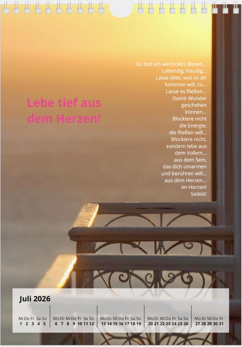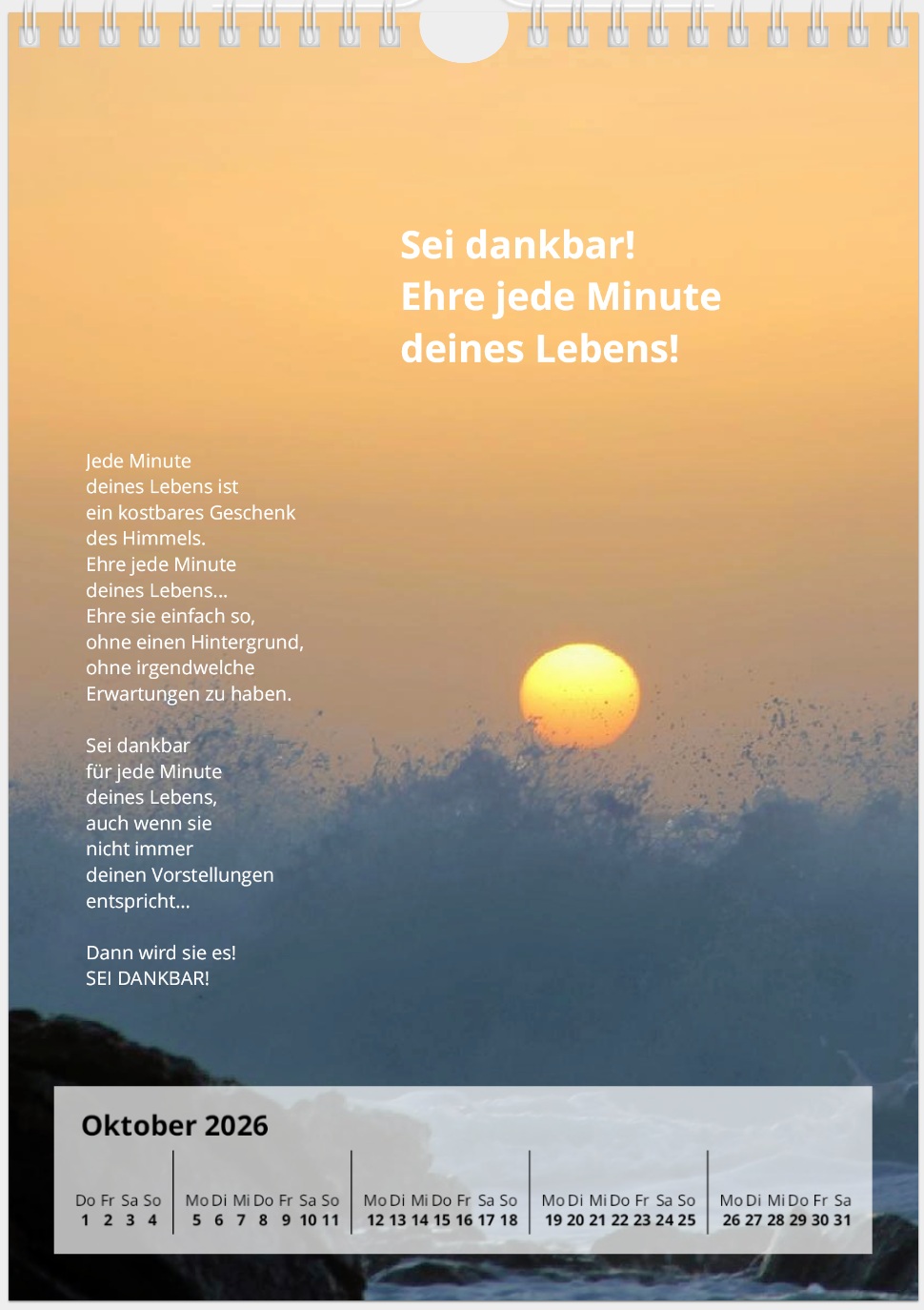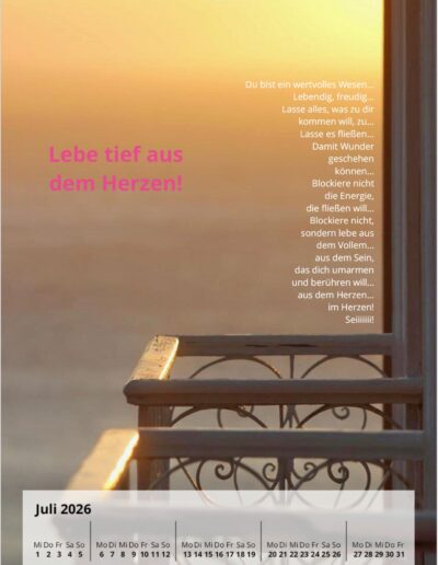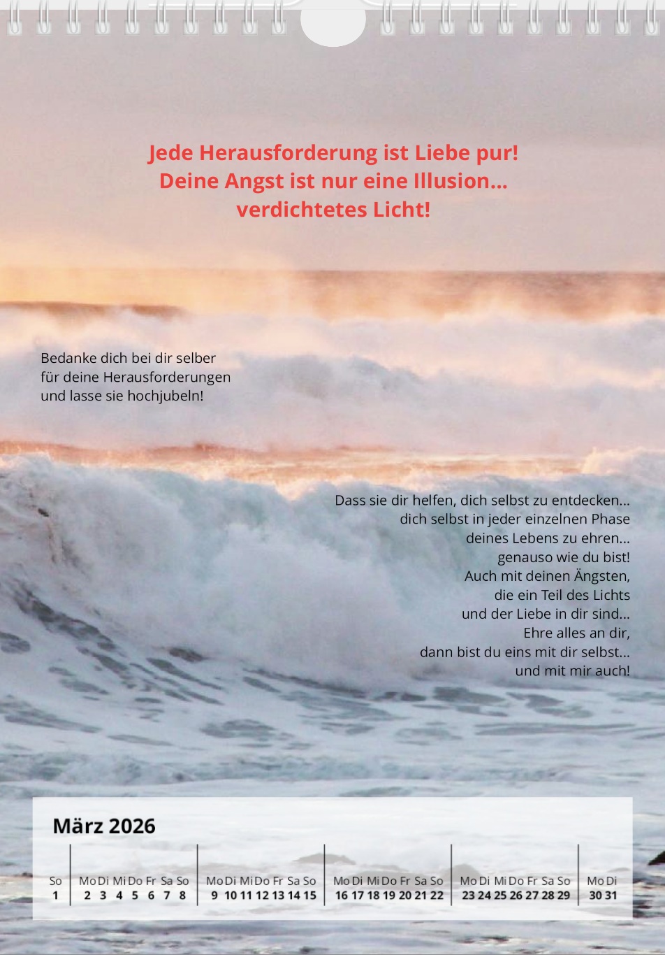 Freude, Dankbarkeit, Vertauen, Hingabe, Liebe, Lachen… Das Leben als Spiel sehen… lauter Qualitäten der Seele, die das Leben schöner machen… durchfluten diesen Kalender!